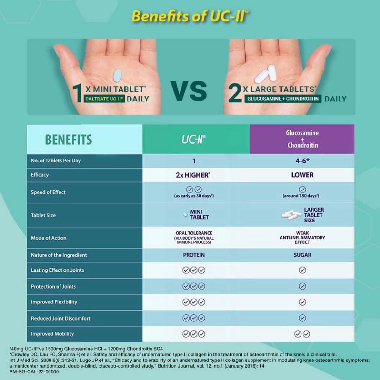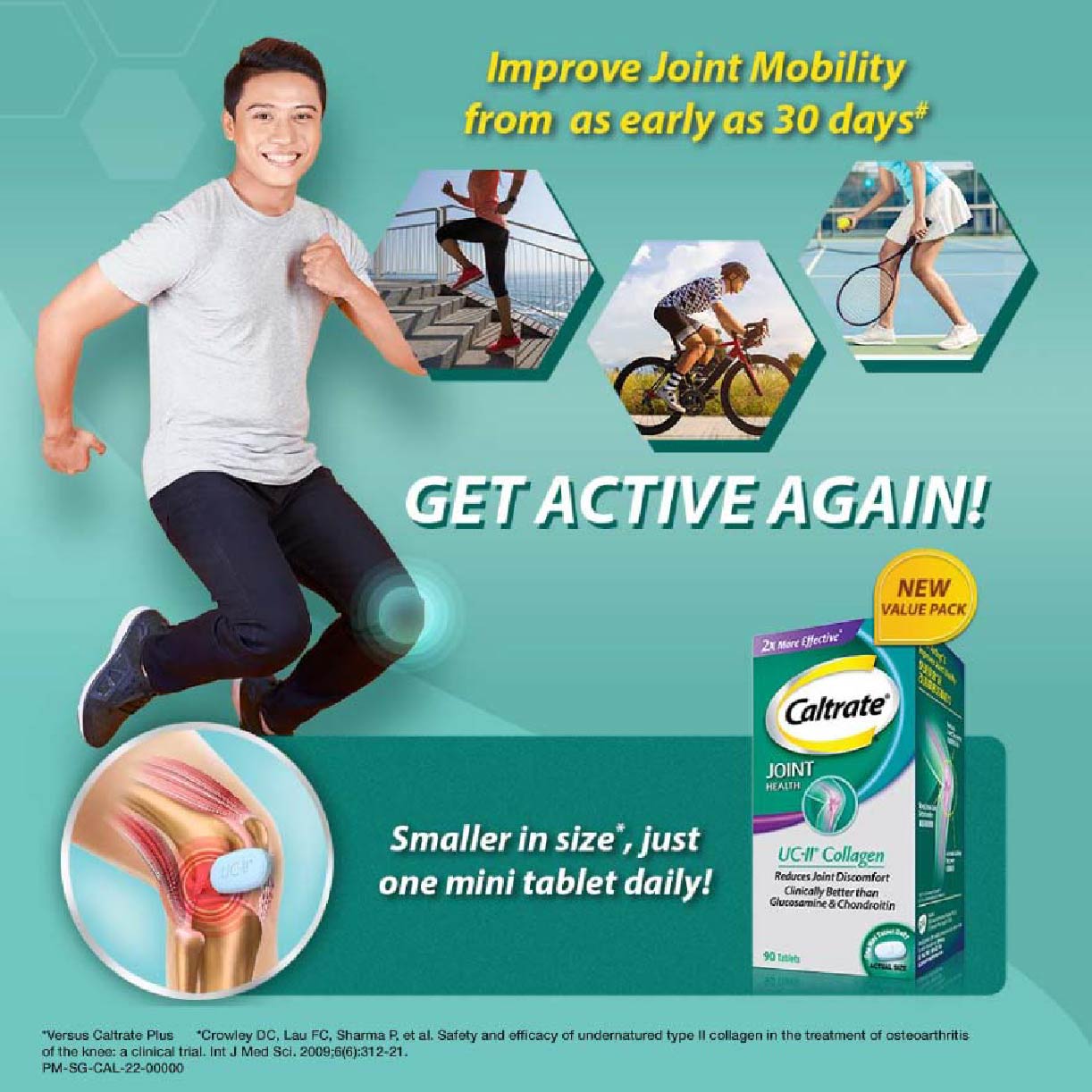 Caltrate Joint Health UC-II Collagen Supplement Tablet (2X More Effective vs Glucosamine + Reduce Joint Discomfort) 90s Support your joint health with the Caltrate Joint Health Undenatured Collagen Type II (UC-II). Caltrate Joint Health UC-II contains UC-II undenatured collagen type II, a patented ingredient that has been clinically tested to reduce joint discomfort and promote healthy cartilage and joint flexibility for healthier and longer active living. MAHS2000216 **Where applicable, items have a minimum of nine-month shelf life before expiry unless otherwise stated on product description.