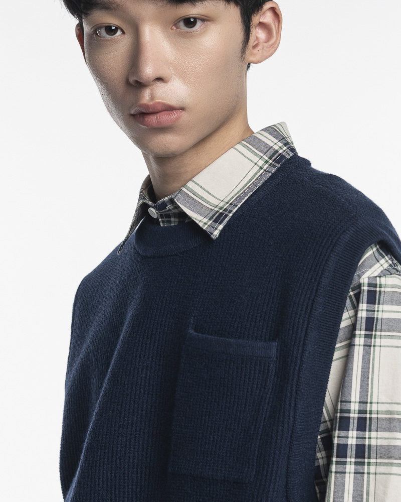 Regular Knitted Round Neck Vest with Ribbed Texture Details and Hem. Comes with Chest Pocket at the front. Made of cotton.