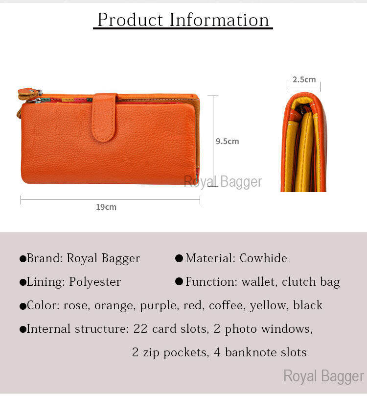 ROYAL BAGGER Purse for Women Genuine Cow Leather Long Wallet Ladies Multifunction Card Holders Wallets Fashion Casual Work Party Clutch Bag